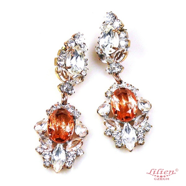 Dangling Czech rhinestone earrings for pierced ears, length 7.5 cm (2.90"), main rhinestones are special handmade pieces created with addition of sterling silver