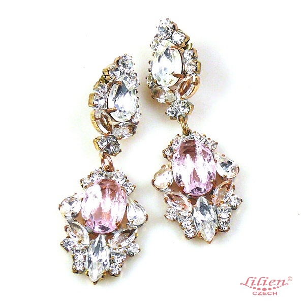 Dangling Czech rhinestone earrings for pierced ears, length 7.5 cm (2.90"), main rhinestones are special handmade pieces created with addition of sterling silver
